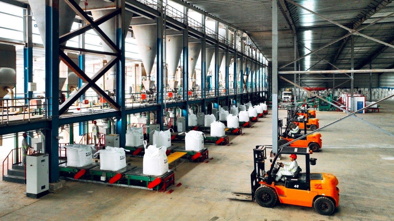 图为亚钾国际老挝现代化的钾肥生产工厂(包装车间)