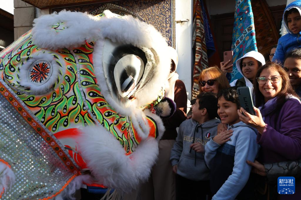 1月22日,在摩洛哥首都拉巴特老城,孩子们和舞狮演员互动。