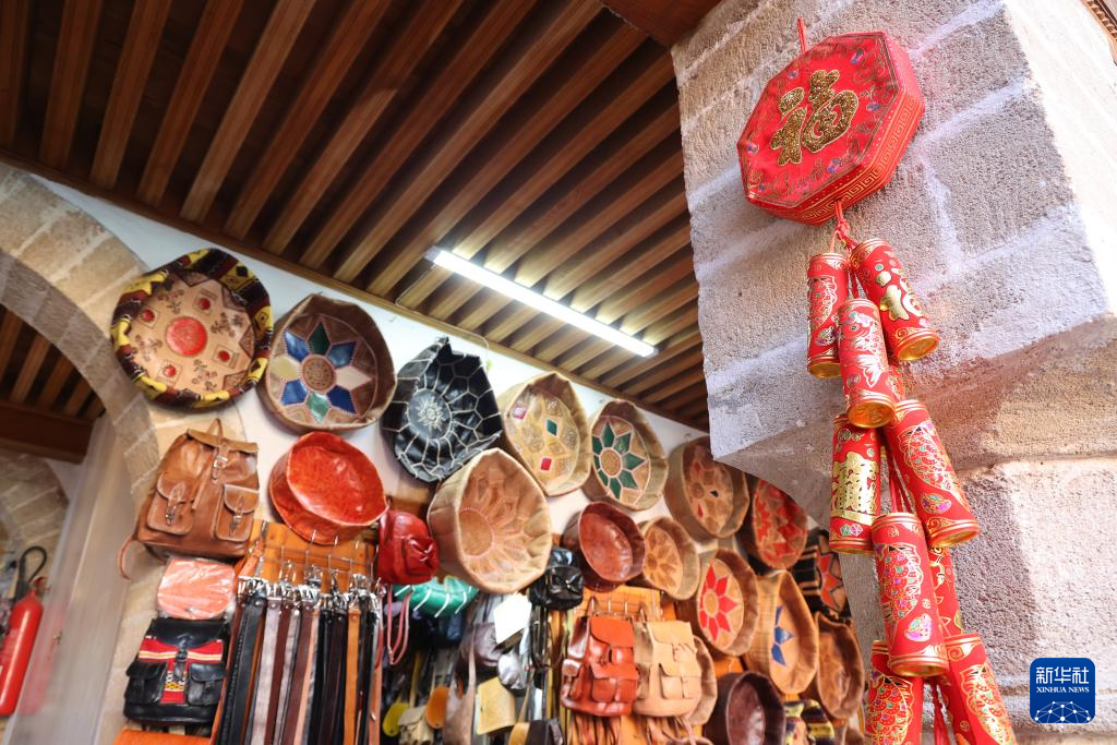 1月22日,在摩洛哥首都拉巴特,中国农历春节装饰品和摩洛哥传统皮制手工艺品被挂在墙上。