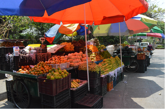 班加罗尔街头小贩用遮阳伞抵挡炙热的太阳
