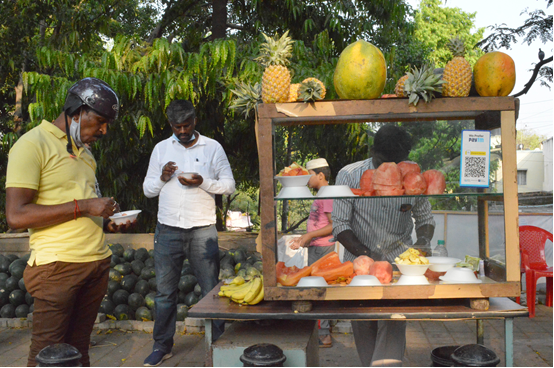 班加罗尔街头居民在水果摊吃水果以缓解炎热